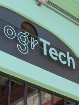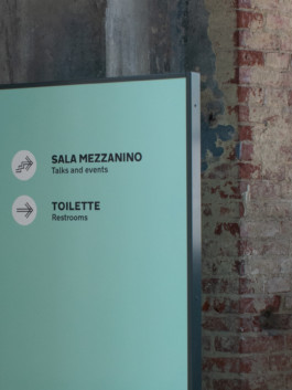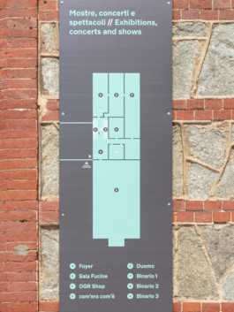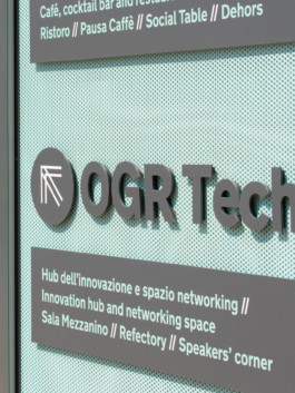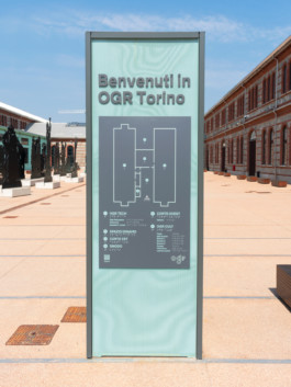 The project includes different signage supports for the three areas of the building that make up the Ogr complex: cultural area, dining area, and co-working space with offices. The various signage supports are made by drawing inspiration from materials already present in the architecture for signage, from the metal gratings of the ramps in the central courtyard to the sheet metal inside the buildings. The signage thus becomes part of the environment while standing out in the bright color of Ogr's identity. The project consisted of flow study, signage and media design, and graphic application of the existing visual identity (designed by Studio FM).